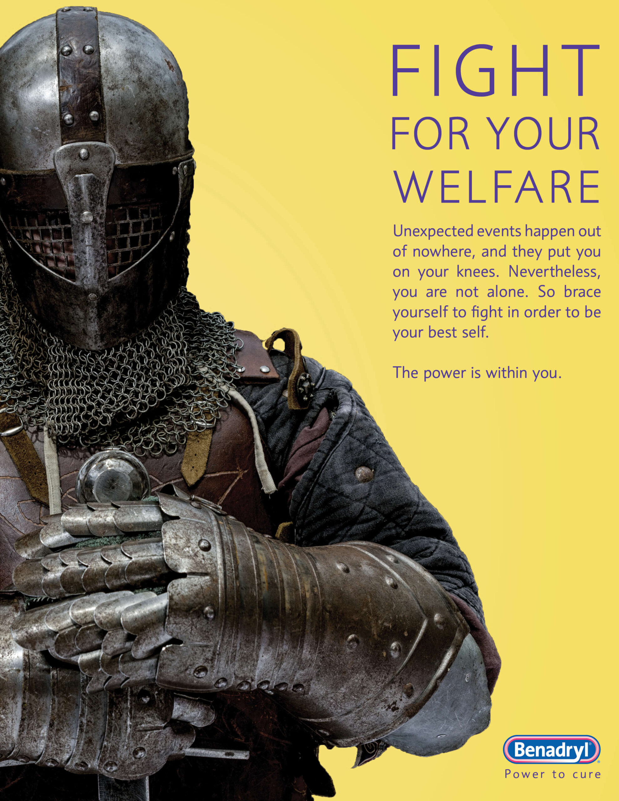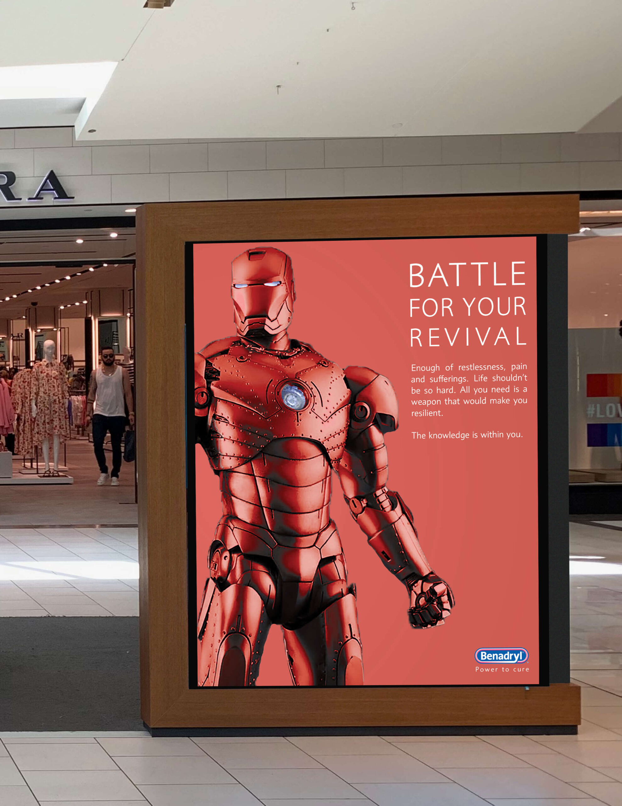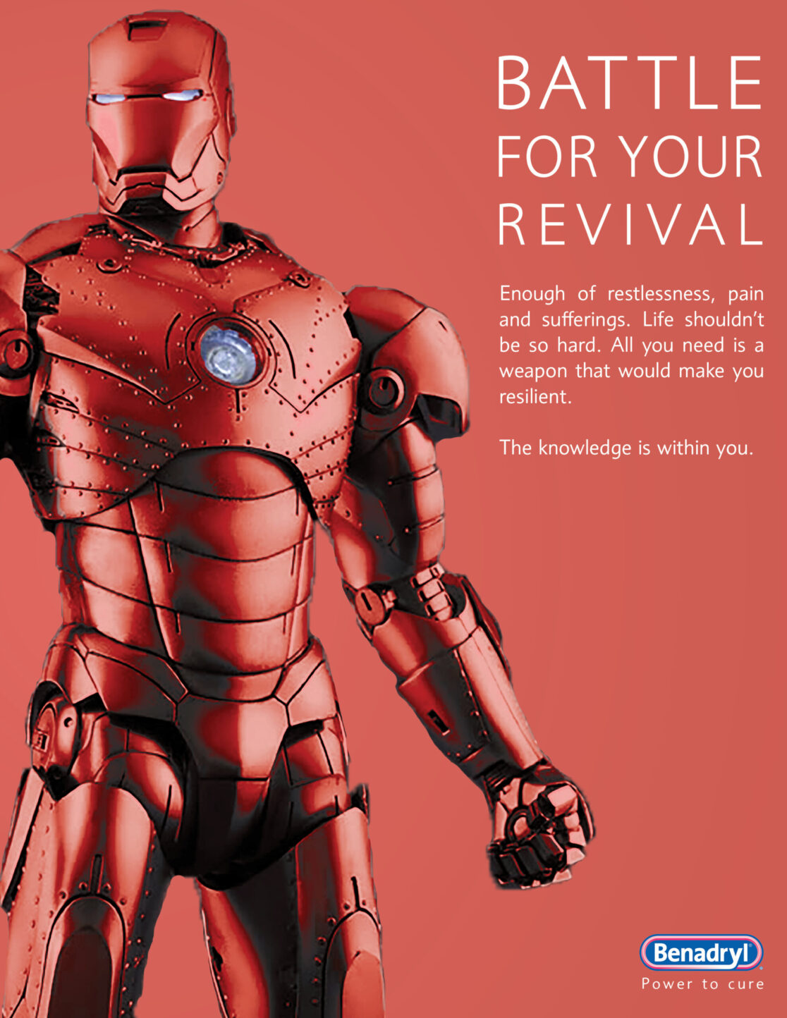 Benadryl has the “Power to cure.” The campaign demonstrates Benadryl is strong. Also, using Iron Man character, knight, and astronaut to appeal to the kids and young parents.