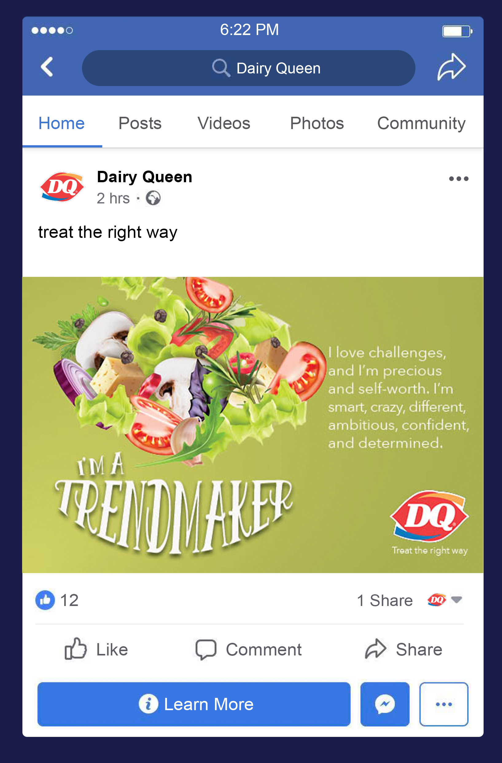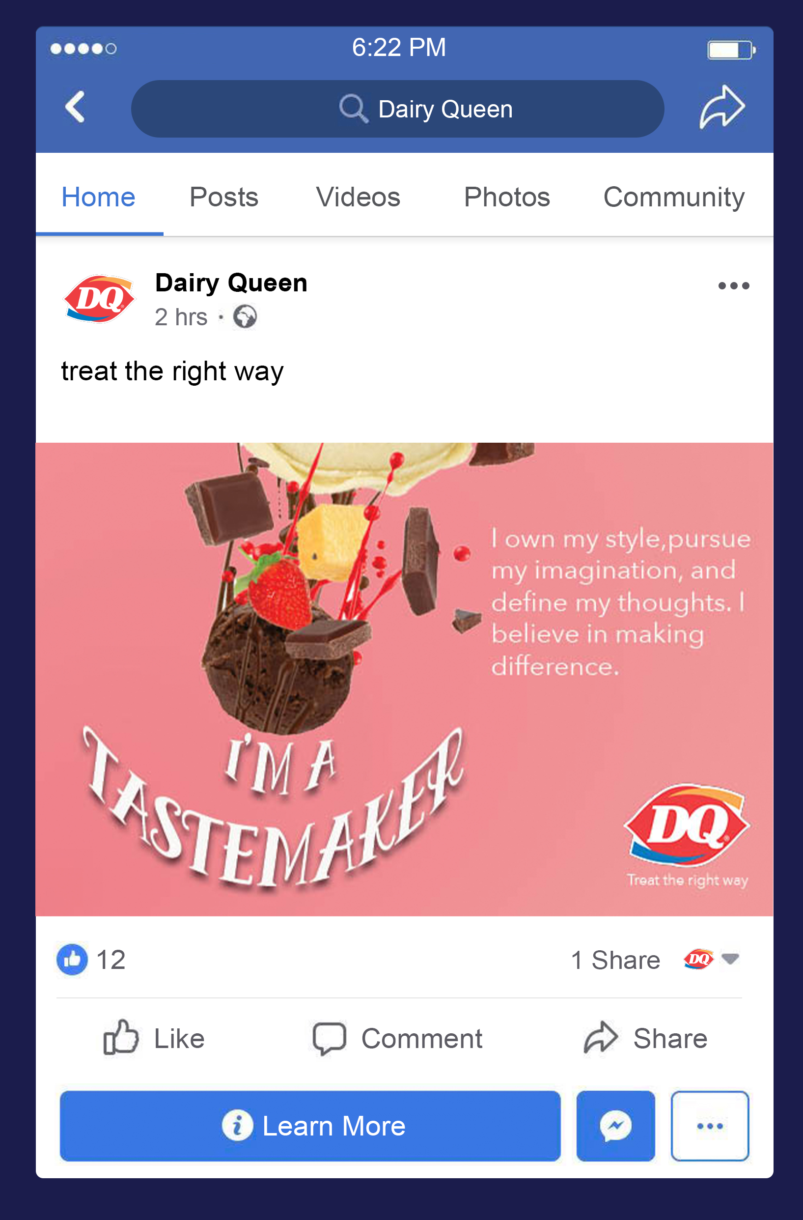 “Treat the right way” is relevant not only to customer service-wise but also since Dairy Queen has adopted healthier food in the menu. Also, they have a reputation for the treats they offer. Again, that is an appealing way to attract female millennials who likes to be inspired.